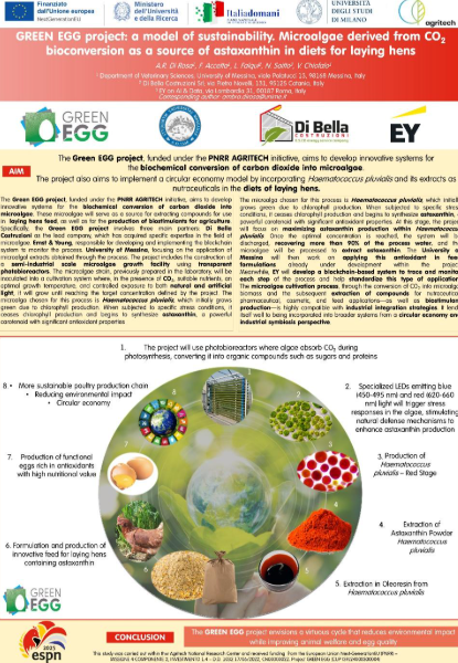 Il progetto ” Microalgae deriving from the biochemical conversion of CO2 as innovative and sustainable sources of functional additives in laying hen diets ” è stato presentato anche in occasione del 24th Simposio Europeo di Nutrizione Avicola (European Symposium on Poultry Nutrition – ESPN), tenutosi a Maastricht, the Netherlands dal 23 al 26 giugno 2025. In questa sede internazionale, il progetto è stato condiviso con una comunità scientifica europea specializzata nella nutrizione avicola. Anche in questo ambito abbiamo voluto illustrare le fasi del progetto. La partecipazione al simposio ha rappresentato un’importante opportunità di confronto con ricercatori, accademici e professionisti del settore a livello europeo.